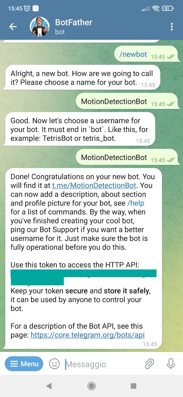 Search for BotFather in your Telegram account and send him a /newbot message, then follow the instructions. You will have something similar to the screenshot below.